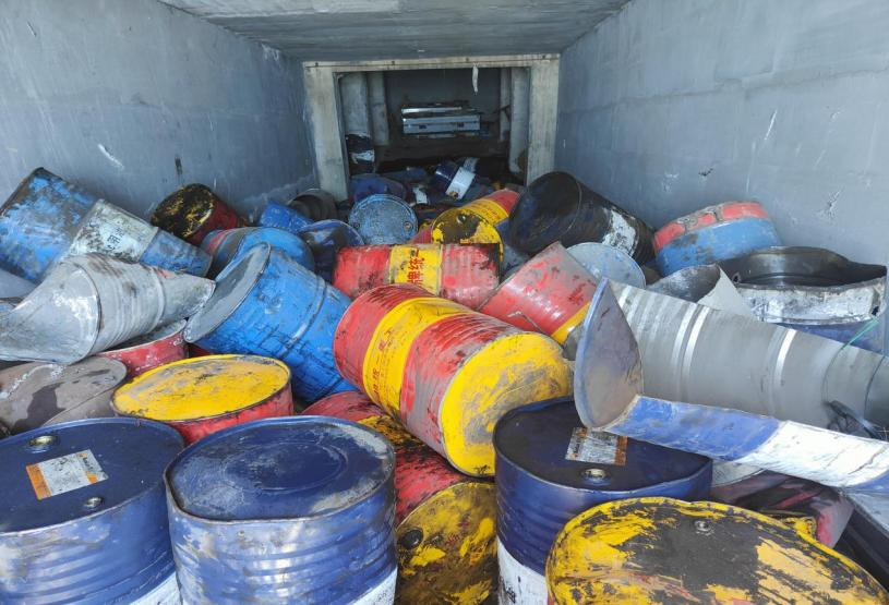 地窖内堆存的大量废矿物油桶,桶内部分存有废矿物油