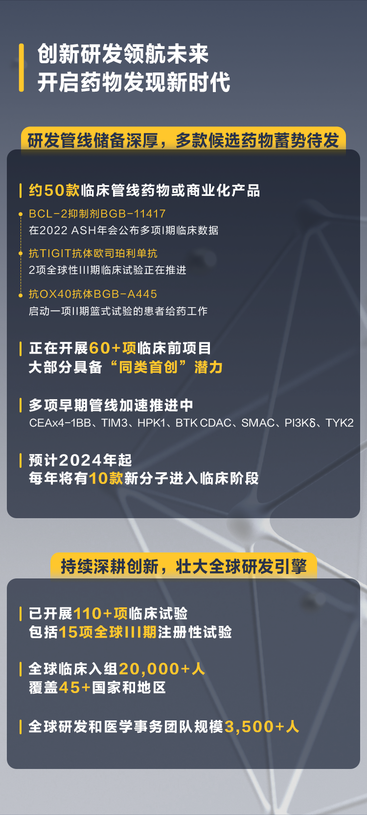2022年,百济神州持续深耕创新研发,全年研发投入为16亿美元。得益于深厚的研发布局,百济神州现拥有约50款临床阶段候选药物和商业化阶段产品。多款药物具备差异化竞争力,已陆续进入临床研究阶段,包括TIGIT抗体、BCL-2抑制剂、OX40抗体、BTK CDAC、HPK1抑制剂、LAG-3抗体等。