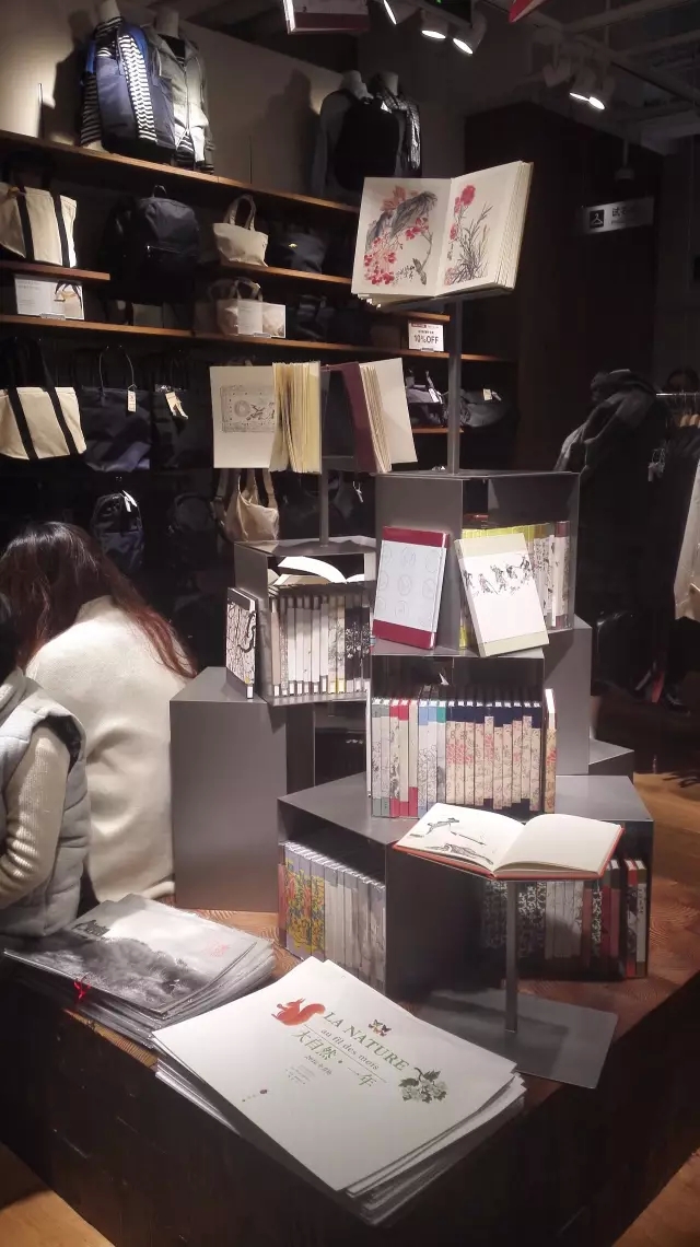 在二楼男装区,无印良品将读库的NOTE BOOK系列和大自然挂历等做了一个小展台。展台上方是用绳子挂起来的笔记本,下方则是好几个方形格子,摆放着五彩缤纷的笔记本,上面还有打开的几个笔记本展示精美插图。男装的颜色总是略显灰暗,这些漂亮的笔记本顿时提亮了周围的色调,而带着孩子等候的妈妈,还能直接坐在展示台边翻阅本子,和孩子一起欣赏美图。