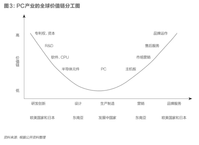 可以说,彼时中国仅负责最基础的组装,芯片、内存、屏幕等核心零部件的增加值主要由日韩厂商及部分欧洲厂商提供,约占总增加值的1/3。而增加值最高的部分,比如研发、零售、客服等主要在美国。